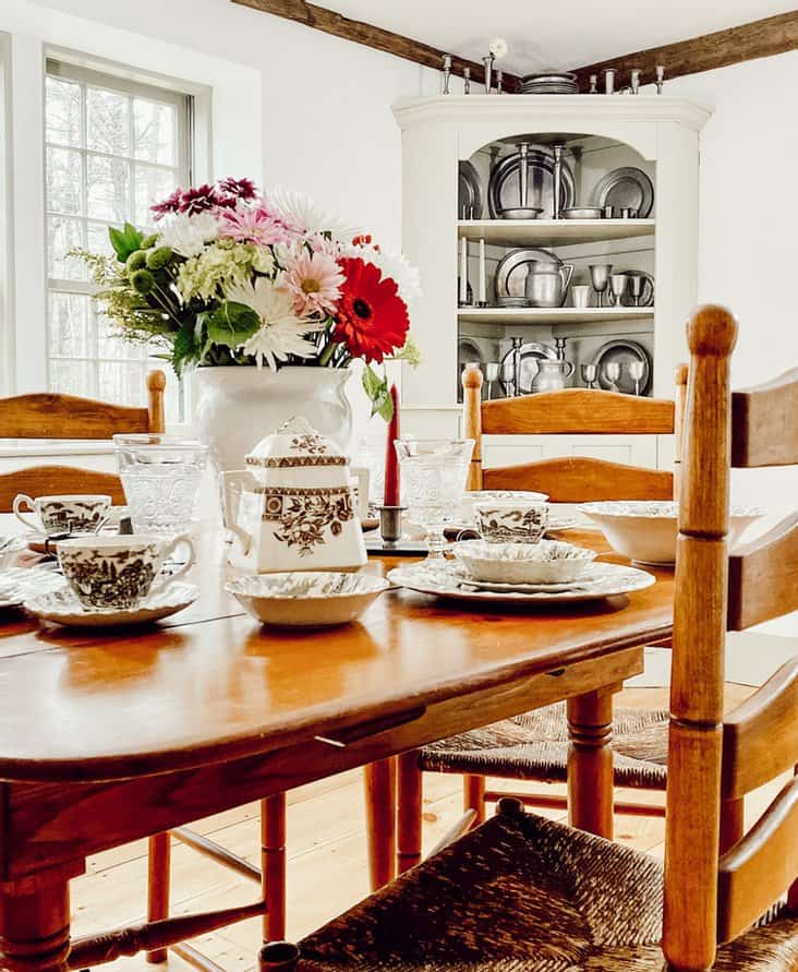 Decorating with antique pewter decor adds timeless elegance and early American charm to any space. Whether you’re displaying a full collection or just a few favorite pieces, pewter’s soft gray tones and vintage patina make it the perfect complement to cozy, collected interiors. I love styling our pewter in meaningful ways throughout our home, from an antique hutch filled with heirlooms to seasonal tablescapes and fireplace mantle vignettes. Explore more in these reader’s favorite’s: