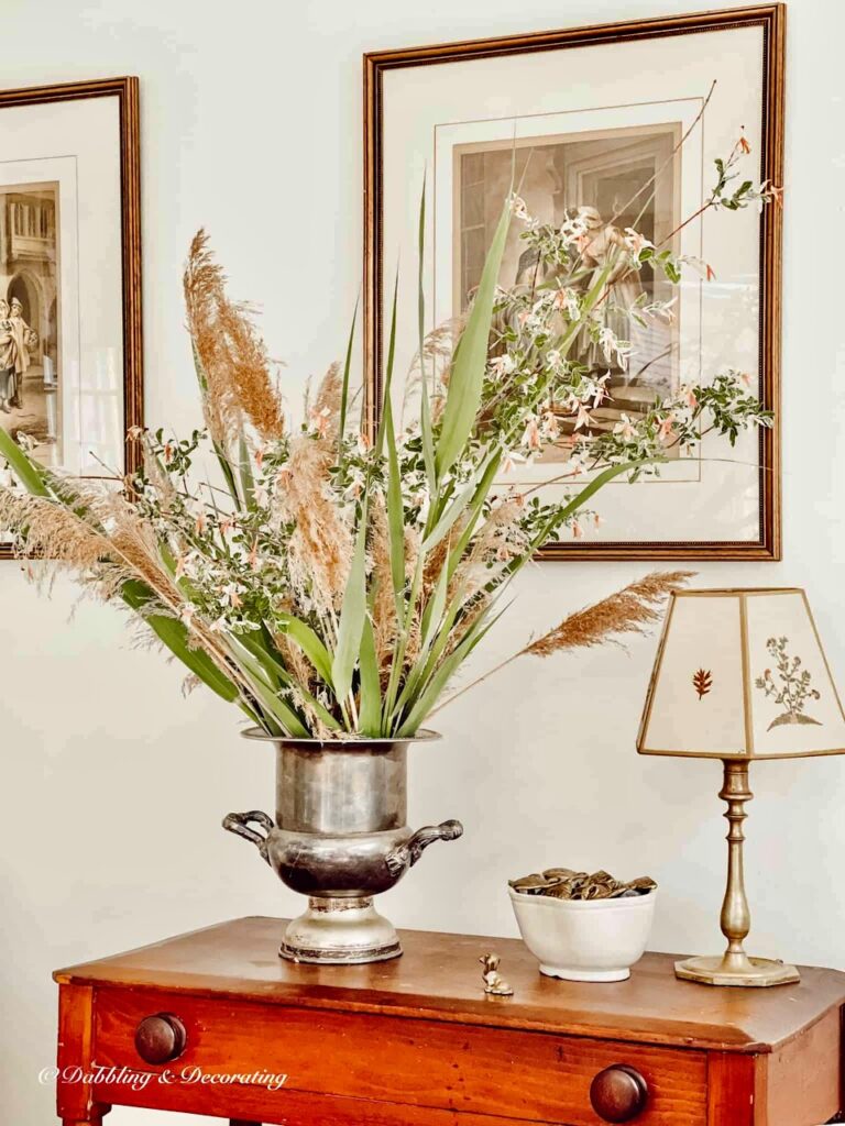 My first set of gathered wildflowers found their perfect match in an old silver champagne bucket—a winter thrifting find I picked up for just eight dollars while out Thrifting with the Gals. I love how the silvery patina plays off the soft neutral tones of the wild blooms and reeds.