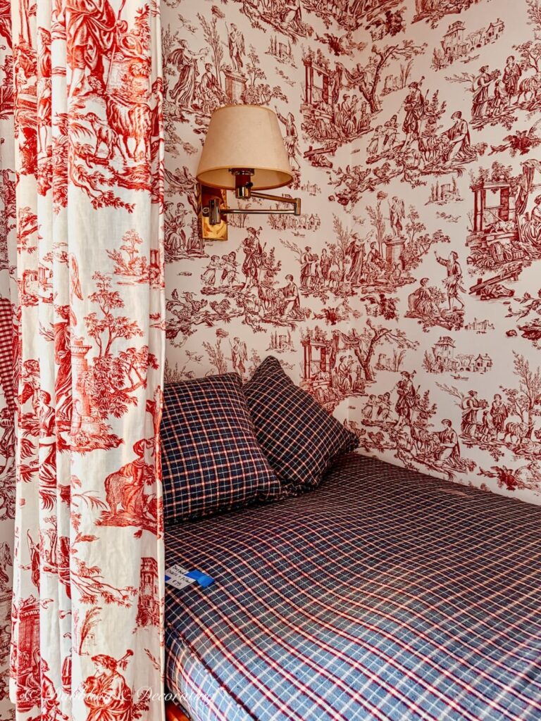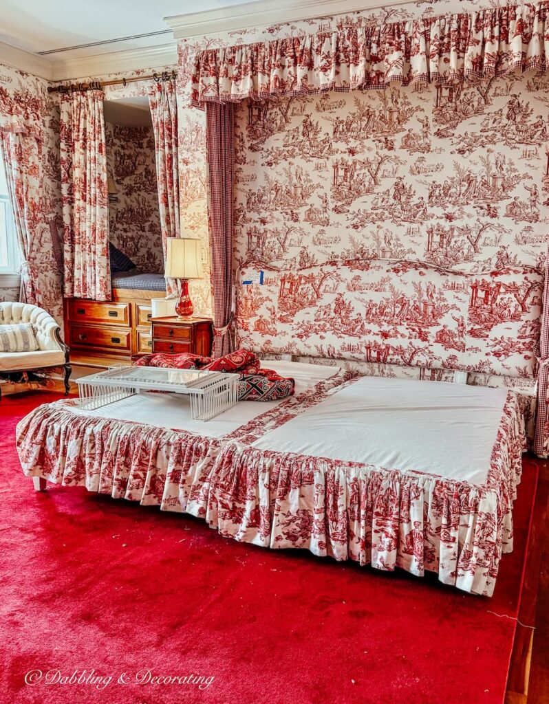This bedroom stopped everyone in their tracks. It was a full red and white toile experience, from the upholstered headboard and bedding to the canopy, curtains, wallpaper, and even red carpeting underfoot. There was even a second bed tucked into a corner behind curtains, layered in more toile and plaid, like the room had been styled by an interior designer who fully committed to the theme. As people wandered through, we all did the same thing, paused, looked around, and quietly said some version of, Isn’t this something.