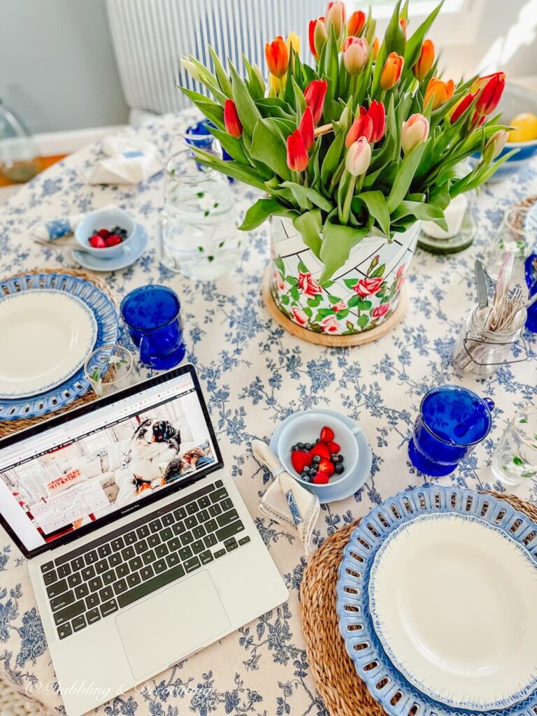 These Easter tulip centerpiece arrangements began with a simple apple-picking-style bucket, given a fresh coat of soft blue paint. Filled with spring tulips, the painted bucket adds a cheerful pop of color to the table while keeping the arrangement relaxed and approachable. It’s a great reminder that tulip arrangements can be created using everyday containers with just a little creativity. Explore more in my MacKenzie-Childs Easter Seasonal Spring Table Decor post.