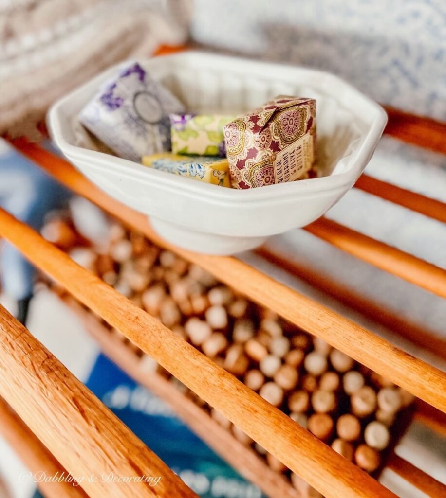 Next, I added a touch of vintage charm with this ironstone mold, now filled with scented hand soaps. It’s a simple way to bring both function and personality to the vintage cobbler shoe stand, perfect for guests who may have forgotten a toiletry or two.
