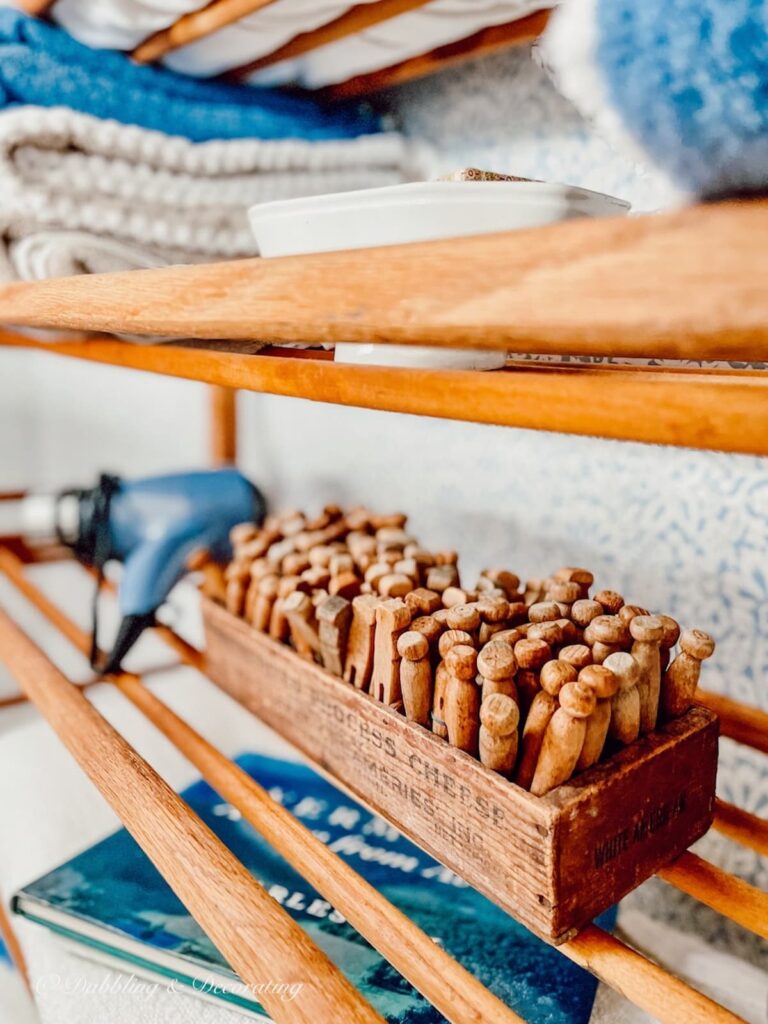 To bring in a little whimsy, I tucked a small wooden carton filled with antique clothespins onto one of the shelves. There’s no real purpose here, other than the fact that they’re just so darn cute!