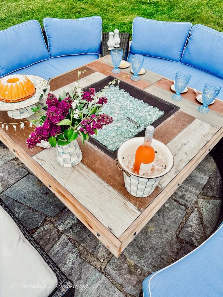 There’s something extra special about serving dessert outdoors, especially when it’s styled with pieces as charming as MacKenzie-Childs Sterling Check enamelware. For this fireside summer setting, I layered blue and silver tones, vintage glassware, and lilacs in bloom — all styled around our backyard fire pit with Ella, our Bernese Mountain Dog, happily curled up next to it all.