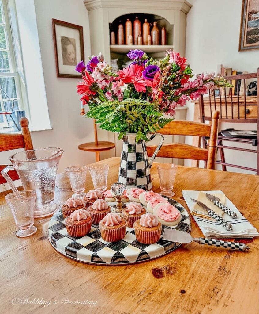 Now, let’s head up to the porch for a second summer dessert tablescape — this time with a patriotic twist using the same MacKenzie-Childs Sterling Check enamelware collection. With warmer weather arriving here in Vermont and summer holidays just around the corner, this porch table felt like the perfect setting for a more festive red, white, and blue dessert moment.