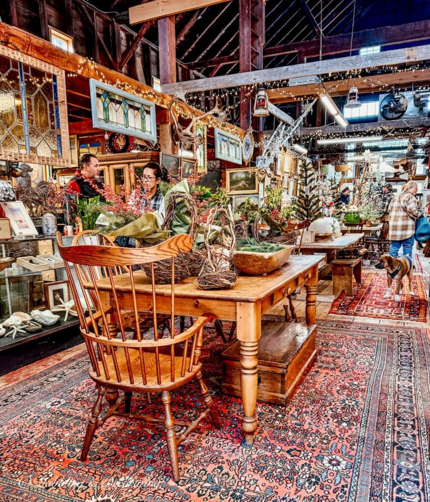 The Historic Frank Todd Barn at Todd Farm feels like stepping into an eclectic, design-forward gift shop layered with vintage charm. Inside, the space is beautifully styled and full of character, with dealers mixing cozy sheepskins, twinkling Christmas decor, and handmade pieces alongside true vintage and antique finds. You will spot long farm tables, pine cupboards, and hutches, some old and some newly built in a vintage-inspired style, plus an entire room devoted to higher-end antiques for serious collectors. It is the kind of place where you can browse everything from an everyday candle or throw for your home to a statement cupboard, farmhouse table, or heirloom-worthy piece, all under the same historic roof.