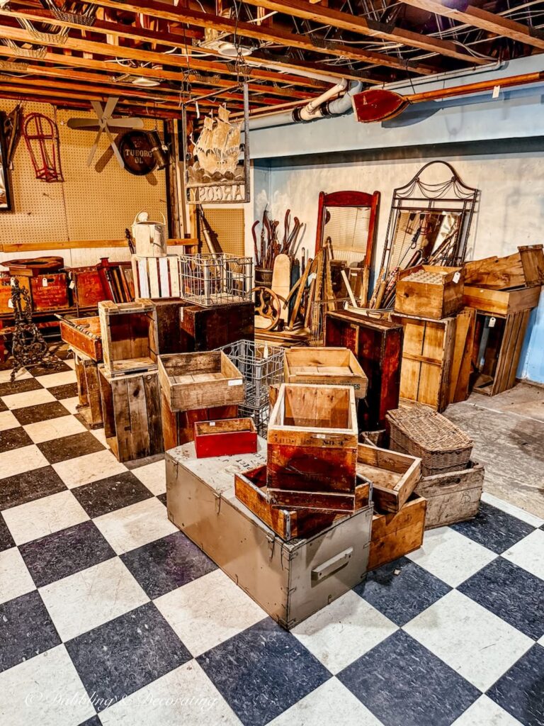 And don’t stop at the main levels, there’s a big reminder sign for a reason: look in the basement. Technically, with the basement, the Vermont Antique Mall becomes a three-level antique stop, and the downstairs is where the furniture and larger finds really shine. Step down, and you’ll land on black-and-white checkered floors, then wander through a maze of antique furnishings and practical pieces, mirrors, chests, wooden crates, old oars, dollhouses, retro outdoor chairs, lamps, desks, dressers, and bureaus, plus the kind of wonderfully random, eclectic finds you didn’t even know you were looking for.